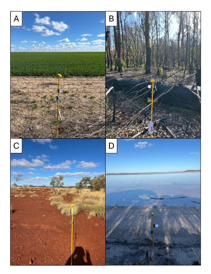 Figure 1: Airborne DNA sampling in four different Western Australian ecosystems. This sampling will be conducted every two months for one entire year to study the temporal aspect of environmental DNA across different ecosystems (A – wheatbelt; B – Karri forest; C – Pilbara region; and D – transient wetland in an arid region.